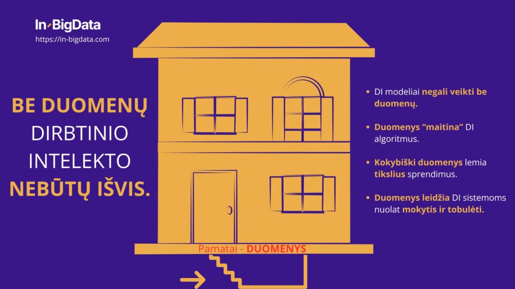 Jei lygintume duomenų svarbą DI su namo statybomis, tai geriausiai šią svarbą atspindėtų pamatai. Duomenys yra kaip pamatai DI. Be jų DI sistema būtų kaip namas be pamatų – nestabili, nepatikima ir netgi neįmanoma. Kaip namas be tvirtų pamatų negali stovėti, taip ir DI negali veikti be didžiulių kiekių duomenų. Duomenys yra esminė žaliava, iš kurios DI modeliai mokosi, analizuoja informaciją ir priima sprendimus.